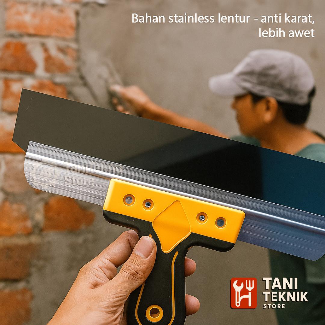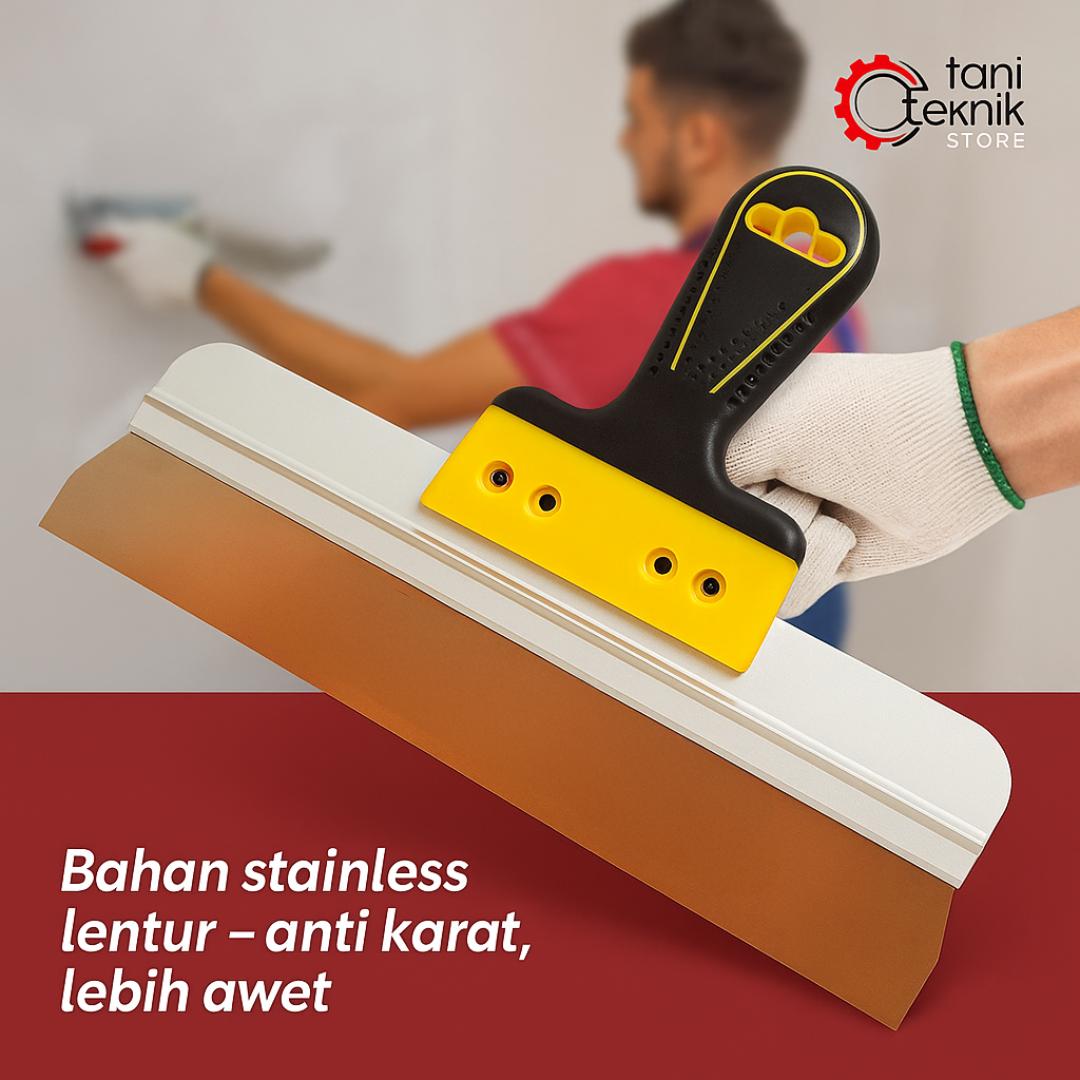 Alat finishing untuk pekerjaan plamir, kompon, dan acian dinding dengan bilah stainless steel dan gagang karet.